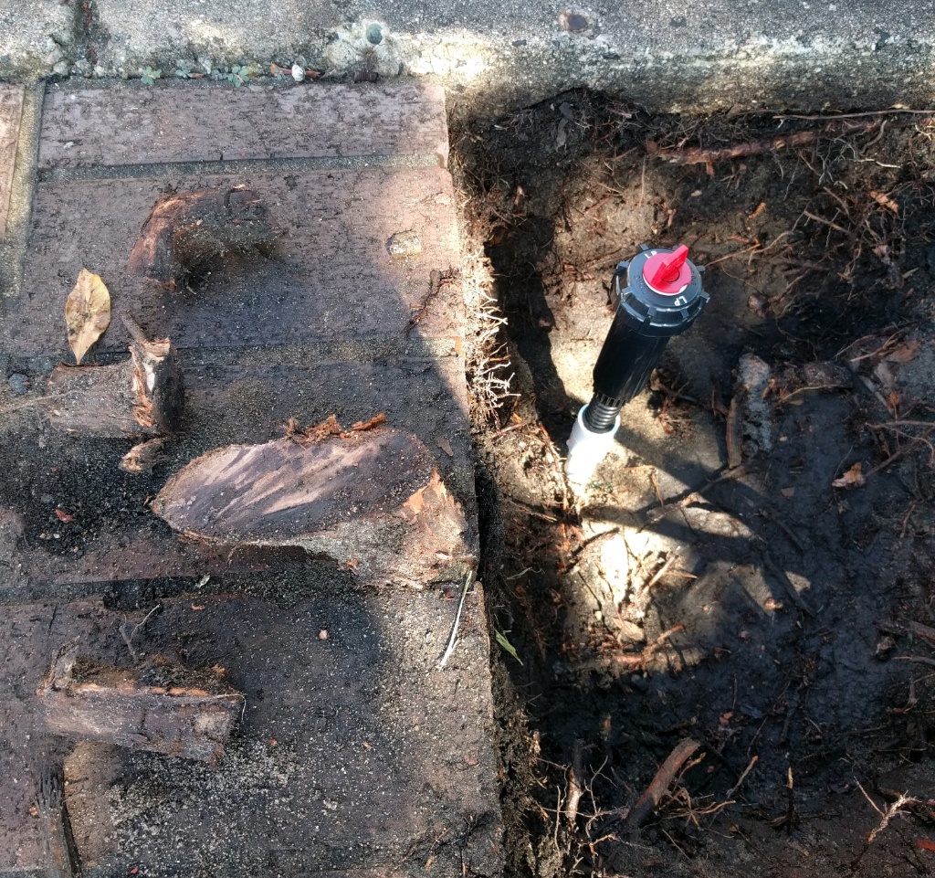 To make sure this doesn't happen again soil and roots were removed so the piping could be changed to allow a pop up to be installed. This new pop up will be level with the ground so no one will be able to kick it (accidentally or intentionally)