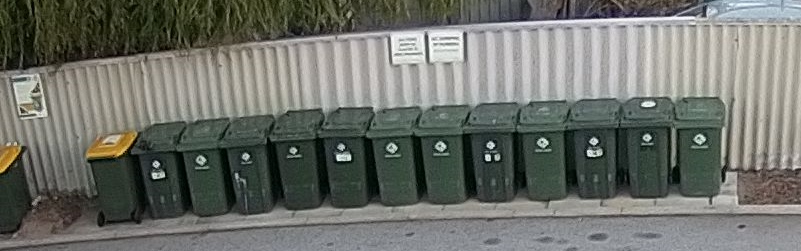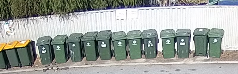 The rubbish bin area is very untidy with much sand and rubbish around bins