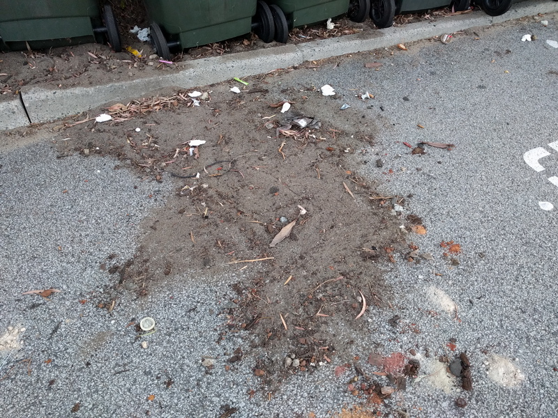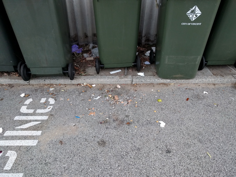 A large amount of small rubbish items have been strewn all around the bin area.