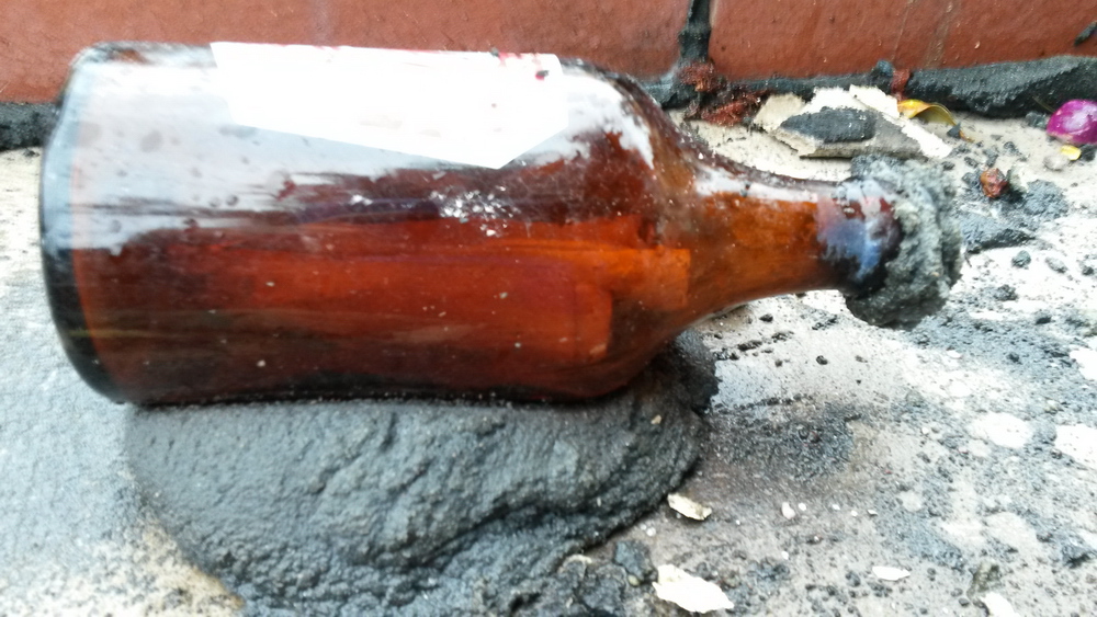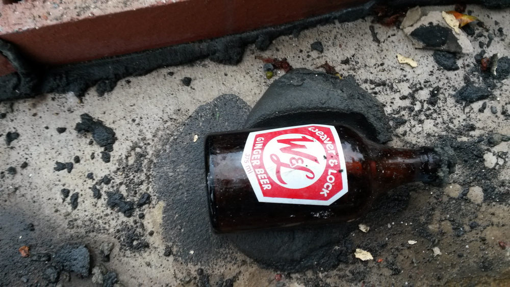 The "Weaver & Lock Ginger Beer" bottle was found just under the top of the row of brick letterboxes closest to Charles Street. The bottle was sealed with mortar and had been pushed into a lump of mortar to keep it in place, a roll of paper could be seen inside the bottle.